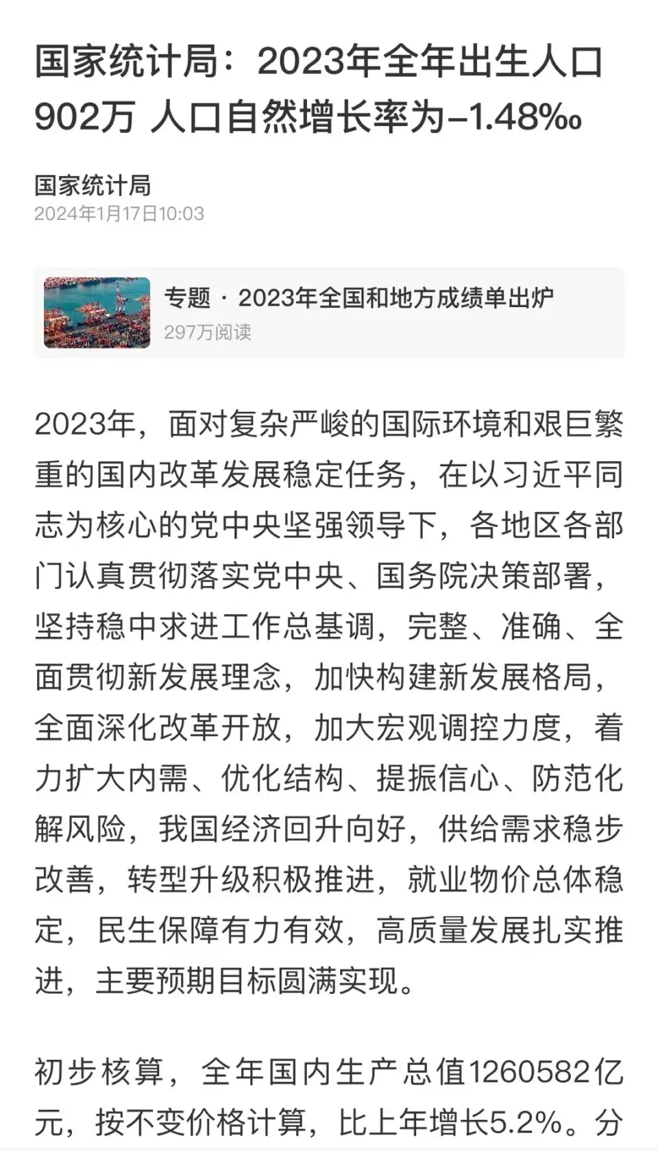 2023年新生儿902万,远远高于此前一些专家预测的800万,也是近7年下滑最低的一年,是一个好消息。但总人口继续负增长,减少幅度与数量扩大,超过200万。
