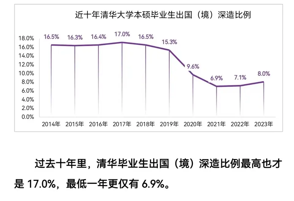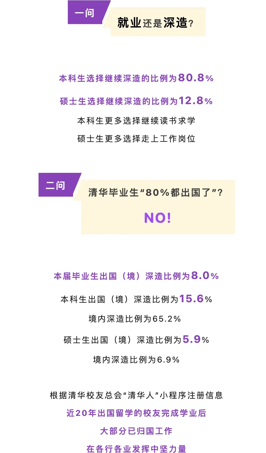 第一, 出国的只有8%,不是80%。清华毕业生中,80.8%本科生继续深造,12.8%硕士继续深造,其中出国深造的只有8%,本科生出国率最高,也只有15.6%,国内深造比例为65.2%。而且特别强调,根据校友会注册信息,近20年出国留学的校友多数都已经回国。