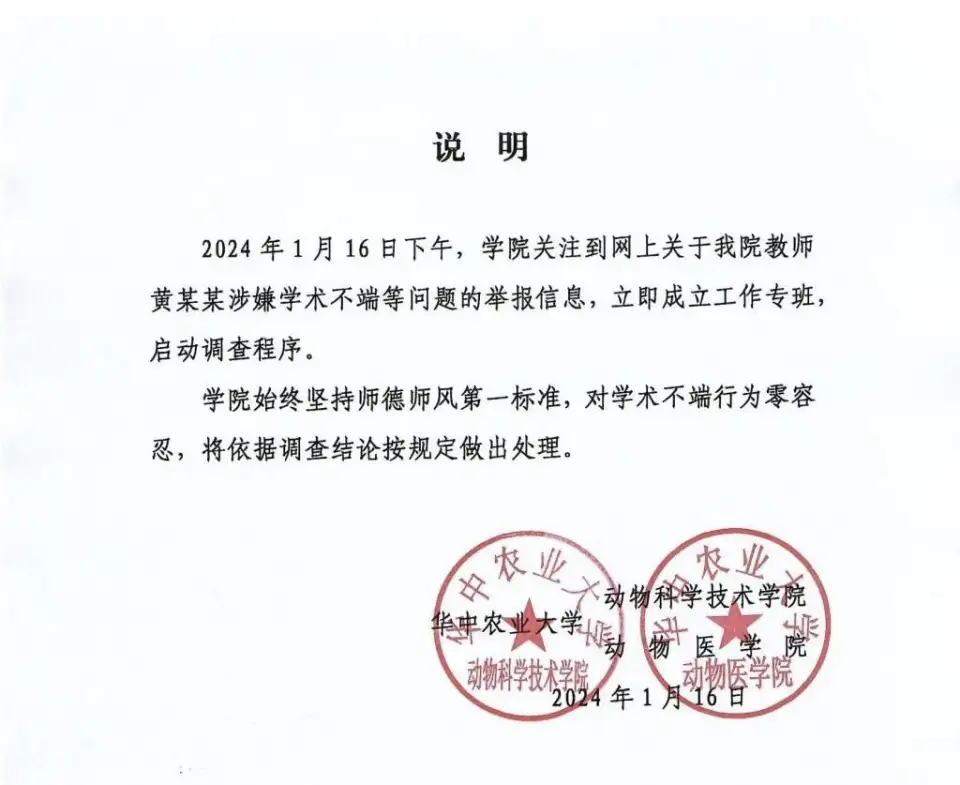 1月16日当晚,华中农业大学动物科学技术学院、动物医学院发布《说明》称,学院已成立工作专班,启动调查程序。学院始终坚持师德师风第一标准,对学术不端行为零容忍,将依据调查结论按规定做出处理。1月17日,华中农业大学党委宣传部工作人员告诉中国新闻周刊,目前学校正在调查此事,若有结果,将会第一时间公布。