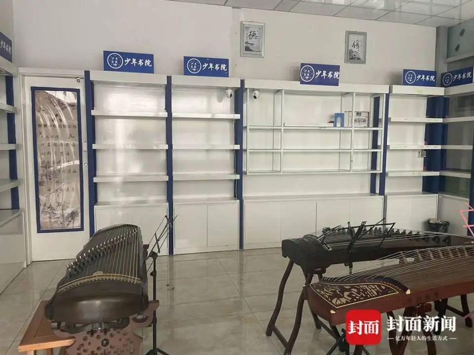 当天上午,记者来到了姚先生报名的少年书院(驷马桥校区),现场门店大门已经上锁,其中一个房间内,书架上空无一物,只有3台古筝。
