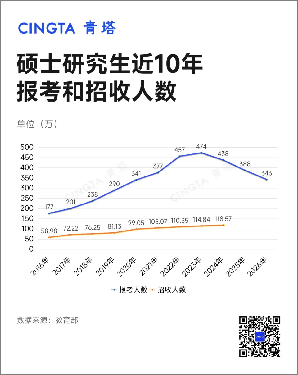 从2016年开始,考研报名人数持续攀升,2022年一举突破400万大关,考研“热”居高不下。但近几年,从2024年下滑40万人开始,考研报名人数持续下降,2026年报名人数为343万,降幅达11.6%。