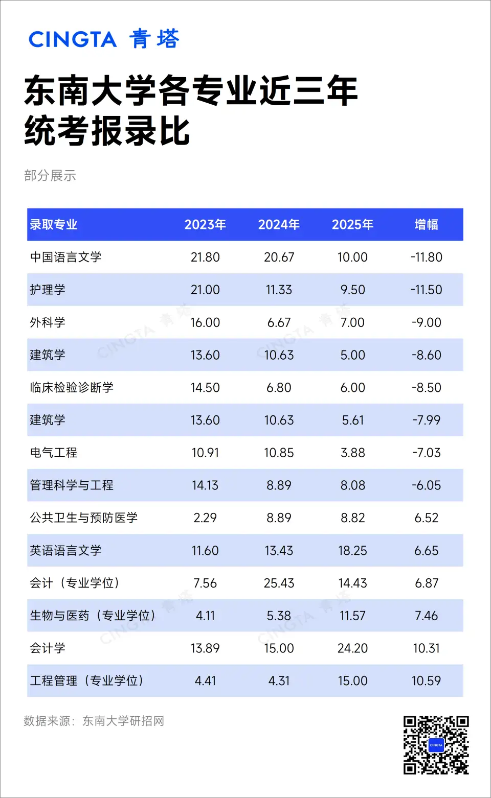 以东南大学为例,2025年中国语言文学、护理学招录比相对2023年的降幅大于10个点,而会计学和工程管理(专业学位)的招录比上升幅度超过了10个点。