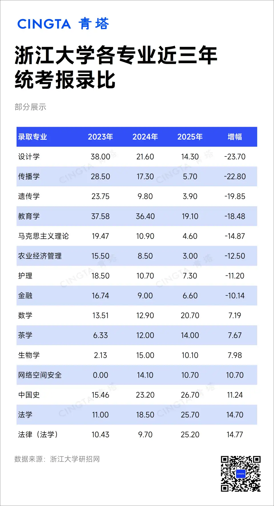 以浙江大学为例,2025年设计学和传播学招录比相对2023年降幅超过20个点,遗传学、教育学、马克思主义理论等8个专业的招录比降幅超过10个点。对于报考这些专业的同学来说,竞争激烈程度得到了较大的缓解。而法学、中国史、网络空间安全等专业招录比的上升幅度超过了10个点,这些考生并未感受到考研“变简单”。