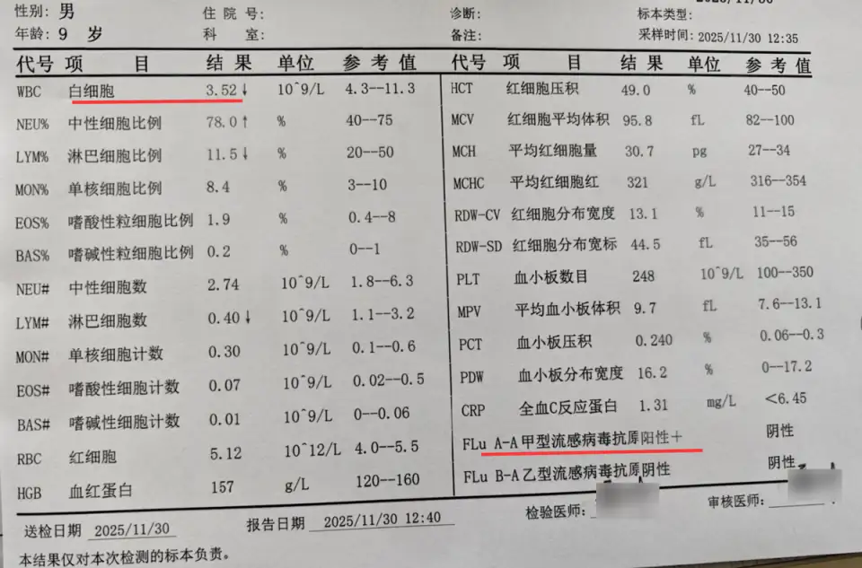 本以为大宝好了去上学,可以庆祝一下了,结果二宝又跟着来了,而且症状和哥哥相似,发烧、吐,早上在家吃了药,接着就去了医院,结果抽血检查后,两人病情不同,二宝是甲流。