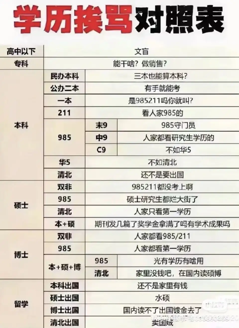 有网友整理出一份学历挨骂对照表,高中以下是文盲,二本是有手就能考,211会被骂不如985。