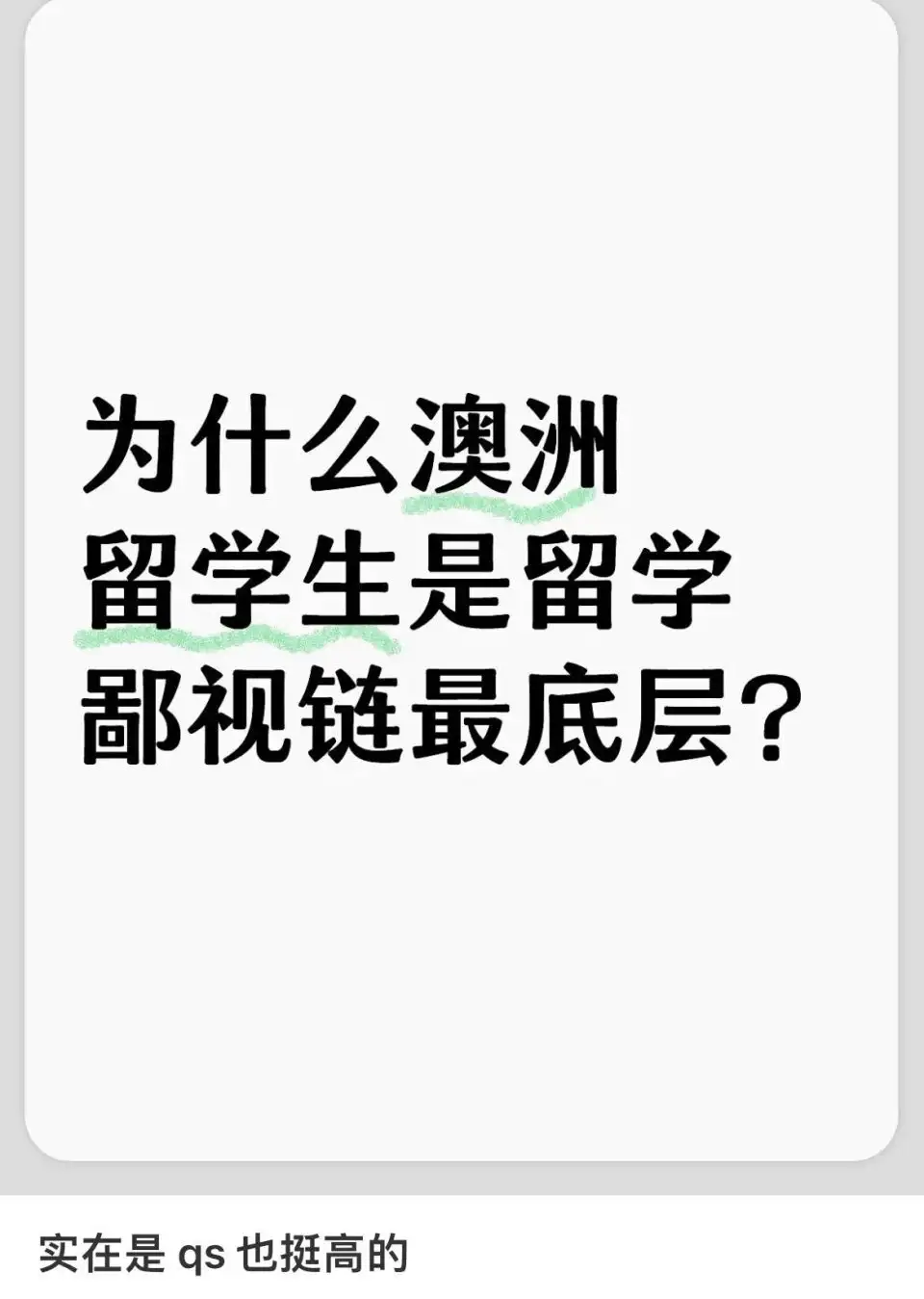 赫子自然不会放过澳洲留学生。澳洲有九所院校都在QS前100,其中两所比耶鲁排名还要高,但见多识广的赫子得知有同学大专单招没过,但直接去了澳洲。于是,赫子怒给澳洲评级为Z。看到这里,澳洲的同学再度破防。在赫子眼里,澳洲高校评级连C都是不,只能是26个字母表的最后一个字母。伤害性不大,侮辱性却极强。