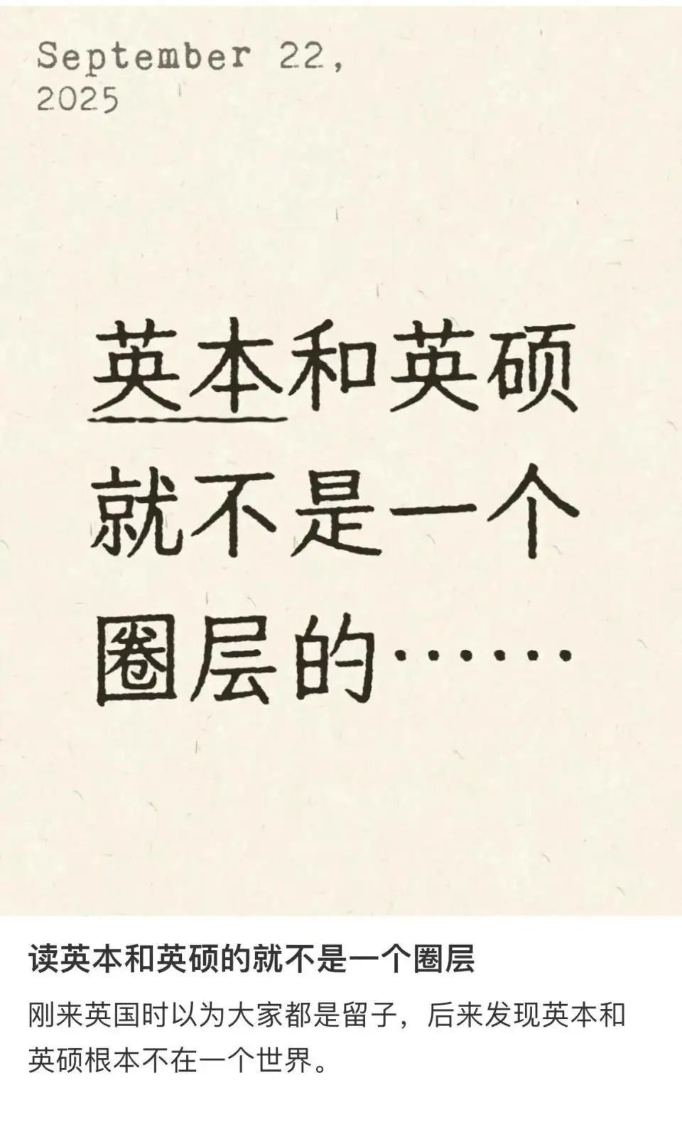 这包括但不局限于,英硕的“羡慕”英本的,英本的“羡慕”英高的。总而言之,越晚出国的留子,越是觉得自己输在起跑线。如今英区留学圈,骂人最不带脏字的一句话大概是,“一年英水硕,一生英伦情”。讲的是那些读了一年短平快英国硕士后,回国后立马把自己的微信地区设置为大不列颠的留子。