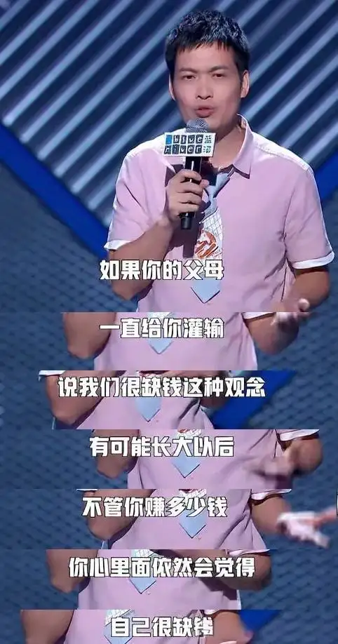 梁海源在《脱口秀大会》上曾发表过这样的观点:如果你的父母一直给你灌输“我们很穷”这种观点,可能你长大后,不管赚多少钱,心里依然觉得自己很缺钱。