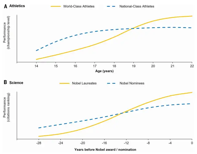 如下图所示,对508名世界级运动员和420名国家级运动员从14岁到22岁的成绩追踪发现,世界级选手在青少年时期的成绩曲线更为平缓,起步更晚。同样,对330名诺贝尔奖得主和1595名提名者的分析显示,诺奖得主在获奖前数十年的学术影响力(引用排名)增长也更为渐进,而非一骑绝尘。