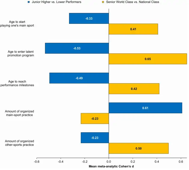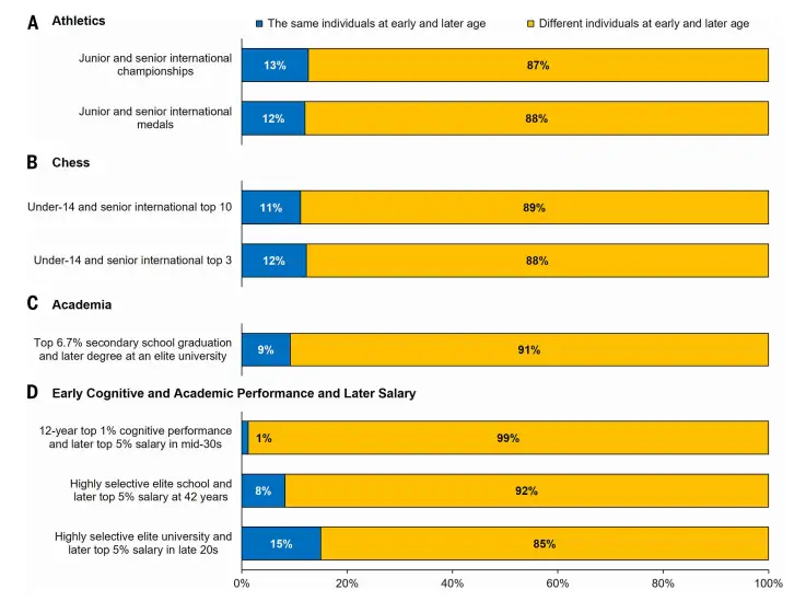 研究揭示了第二个反常识的模式:在最高水平的成年选手中进行比较时,早期的表现水平与最终的巅峰成就呈负相关。