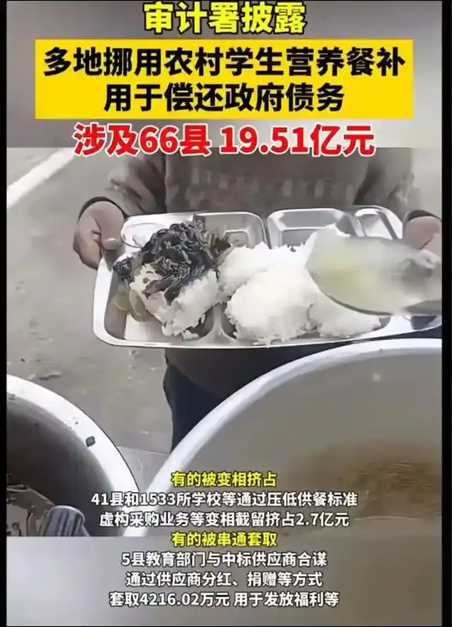 多地甚至将中央财政拨付的近20亿元营养餐补助资金,违规用于偿还地方债务、发放人员福利等。