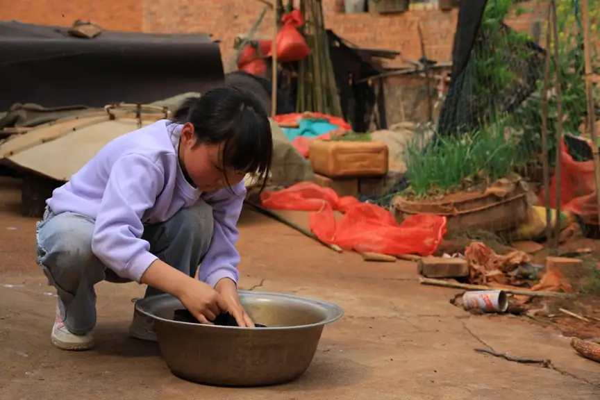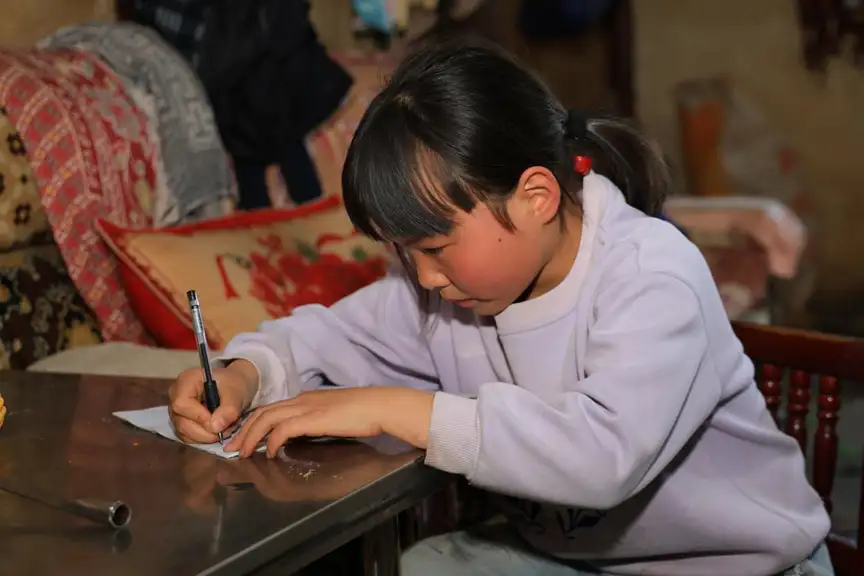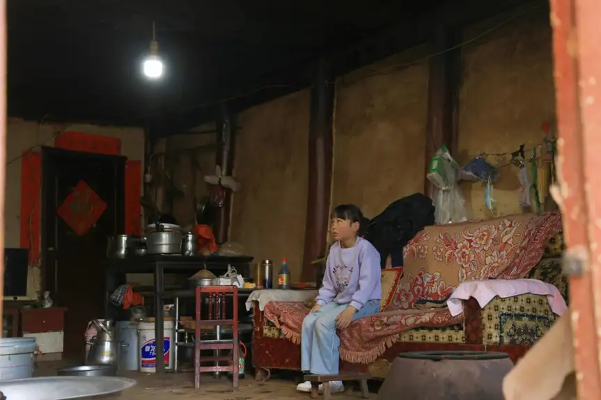 光秃的水泥地,十根木柱子撑起了老旧的房梁,一张破旧的沙发,一台二手的电视,漆黑的小屋里,白天写作业的彤彤,必须打开灯泡才能下笔。“爷爷捡破烂,拾回来一个电饭锅,这样早晨的时候,奶奶就不用太早起床去生火了。”彤彤的懂事叫人心疼,她埋头仔细抠着碗里的菜叶,每次吃完饭,彤彤都会主动地把碗筷放到不锈钢盆里,泡上一会儿后再一个个刷干净。“彤彤有心劲儿,卫生室免费的药,到日子时候,她下了学顺路就给带回来了,一点都不用我们操心,回来还告诉我要怎么吃。”