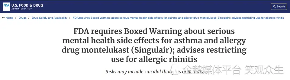 2020年:FDA升级为最高级别“黑框警告”,提示严重神经精神事件风险,建议轻症过敏性鼻炎患者优先选其他药物。