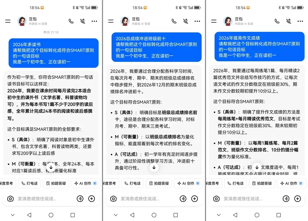 比如问豆包:请帮我把这个目标转化成符合SMART原则的一句话目标。我是一个初中生,正在读初一。
