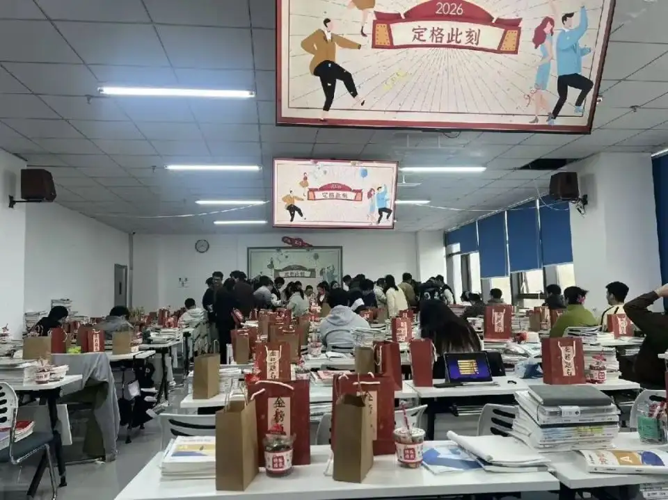仪式现场发放了纪念品,红色的“金榜题名”礼袋里,装着举牌的小猪玩偶、面包、花生糖。同学们去讲台上抢零食,那里还有印着每个人名字的可乐,以及一个大蛋糕。班主任播放了一段自制的视频,配上煽情的音乐,之后开始推销面试课。气氛瞬间转换,李悠说,“眼泪一下子就收住了”。