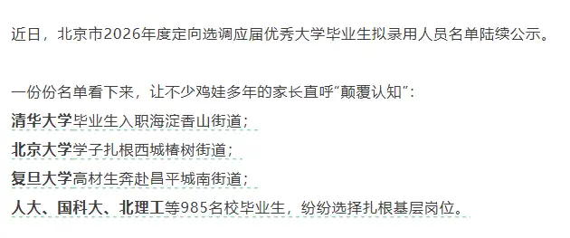 至于“普通”清北毕业生,其实是没有资格挣这个量级的钱的,更多会选择“编制”。最近有篇文章也引发热议,如今清北毕业生竟然已经在竞聘街道的岗位了。