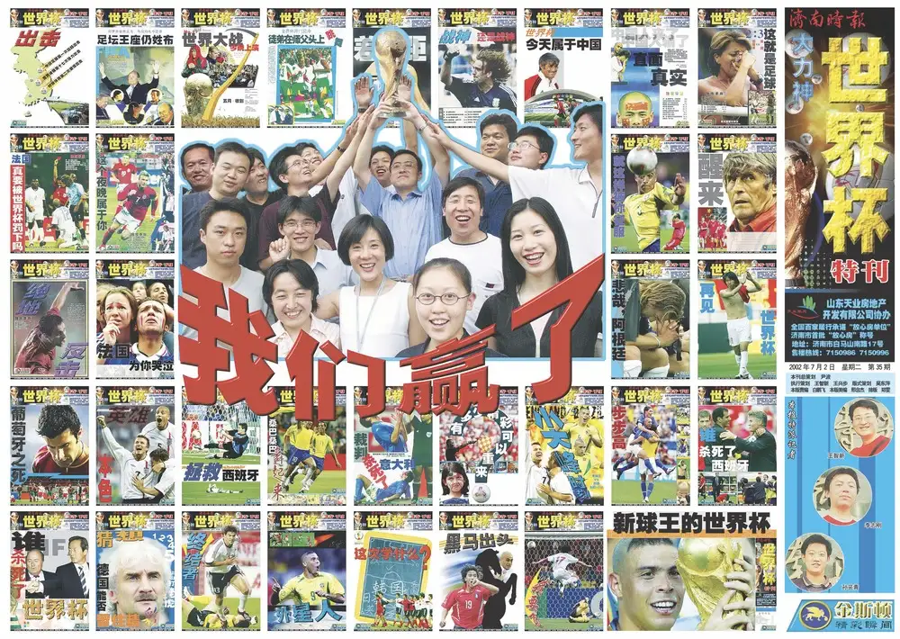 一炮打响,一发而不可收。其后又经过一期主要用于打磨细节的试刊,1997年1月1日,每周一8到12个版的《时报体育》周刊正式出版。到2002年韩日世界杯,国足首次也是至今唯一一次跻身世界杯决赛圈,举国沸腾,时报世界杯特刊亦达到每天16版和周一24版的空前规模,标志着时报体育的巅峰时刻。记得韩日世界杯前不久,如日中天的足球报要在济南选择新的分印点,我陪足球报老总、中国足球传媒泰斗严俊君先生在济南考察,他翻阅着我们近七年数百期《时报体育》,既恍然大悟又半开玩笑地对我说:“我今天终于弄明白了,每期发行300万份的足球报,为什么在山东这样的球迷大省每期只能发7万份。原来是你抢了我们的生意!”