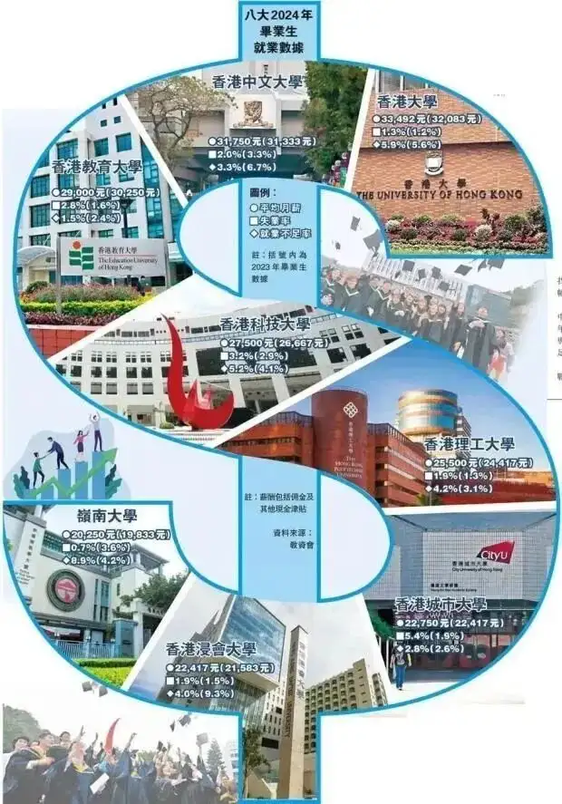此外,UGC香港大学教育资助委员会此前在官网发布的《2023/24学年全日制学士学位课程毕业生就业调查》显示,港八大本科毕业生平均年薪达到32.9万港币,折合人民币约30.2万元,全职就业率为70.8%。