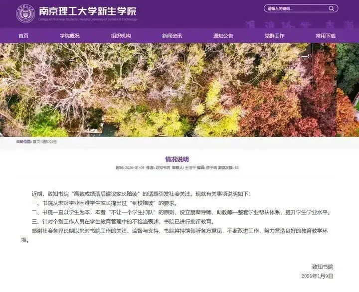 1月9日,南京理工大学致知书院发布情况通报称,从未对学业困难学生家长提出过“到校陪读”的要求,针对个别工作人员在学生教育管理中的不恰当表述已进行批评教育。书院一直以学生为本,本着“不让一个学生掉队”的原则,设立朋辈导师、助教等一整套学业帮扶体系,提升学生学业水平。