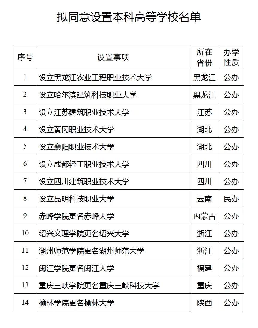 1月12日,教育部公布关于拟同意设置本科高等学校的公示。根据《中华人民共和国高等教育法》《普通高等学校设置暂行条例》《普通本科学校设置暂行规定》《本科层次职业学校设置标准(试行)》等有关规定,经教育部党组会议审议,拟同意设置黑龙江农业工程职业技术大学等14所学校,其中6所高校更名大学,现予公示。