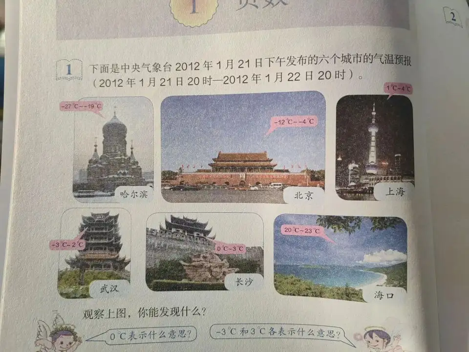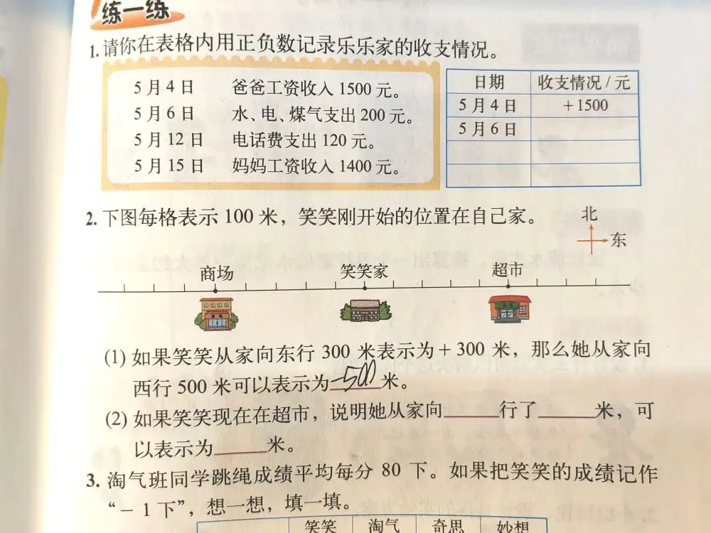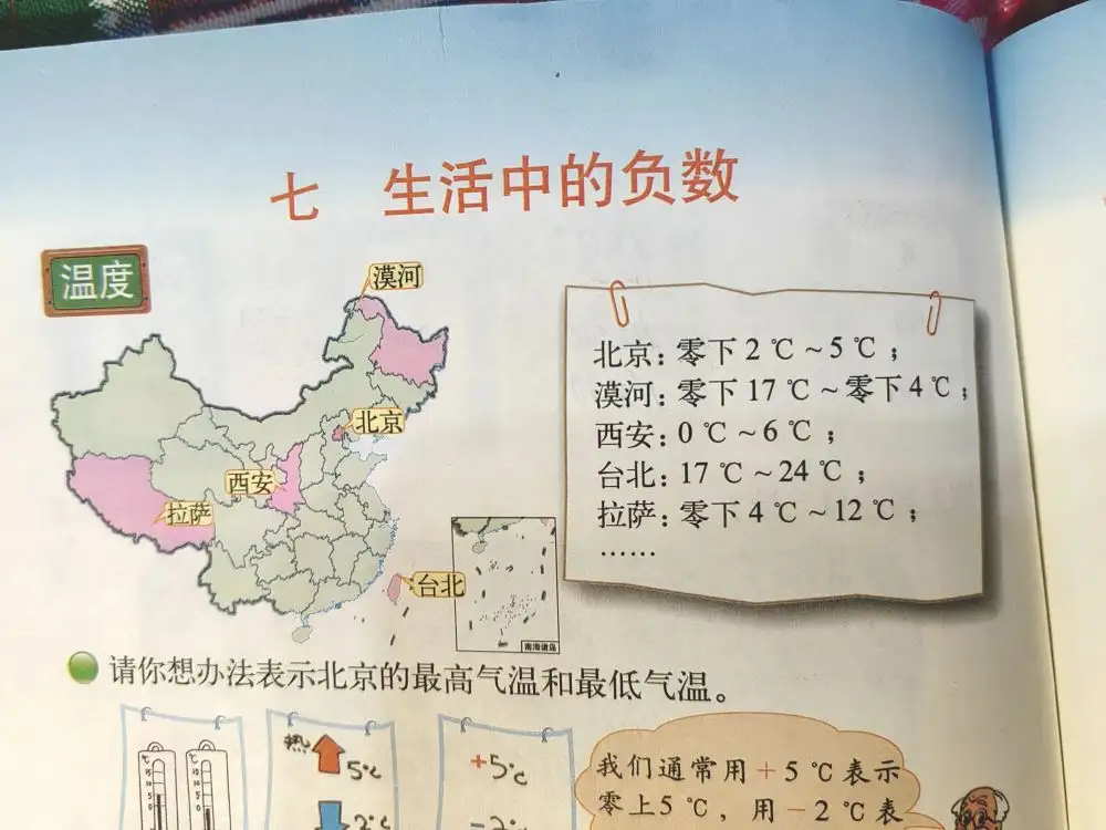 (北师大版本的四下数学,引入了相反的量,海拔、东西、经营。)
