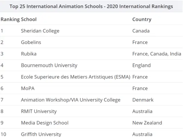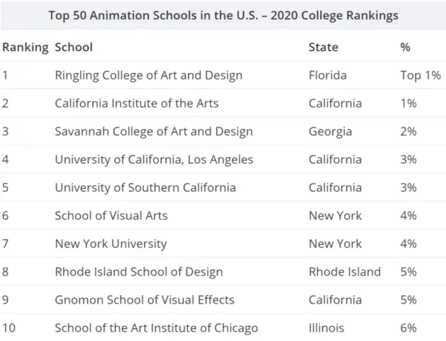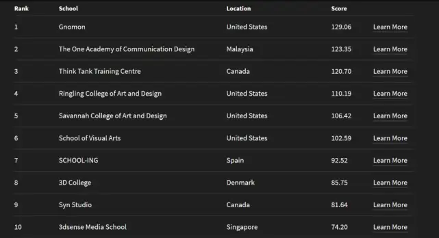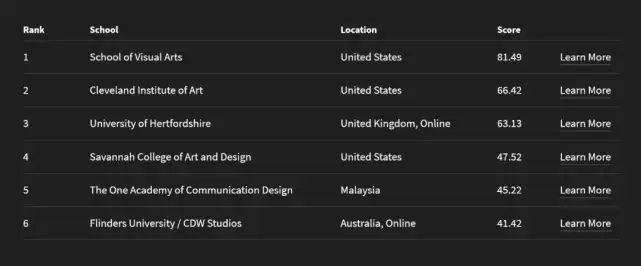动画专业有整体国际榜单(不包括美国),也有英国、法国、澳洲、西班牙、亚洲的Top 5,整体上还是比美国本土排名要粗糙很多。)