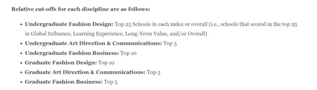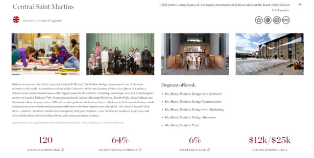 知名时尚商业网站Business of Fashion自2015年起,每年会揭晓时尚专业各领域世界大学排名,从全球影响Global Influence、学习体验Learning Experience、长期价Long-term Value值三个主要方面做出评判。