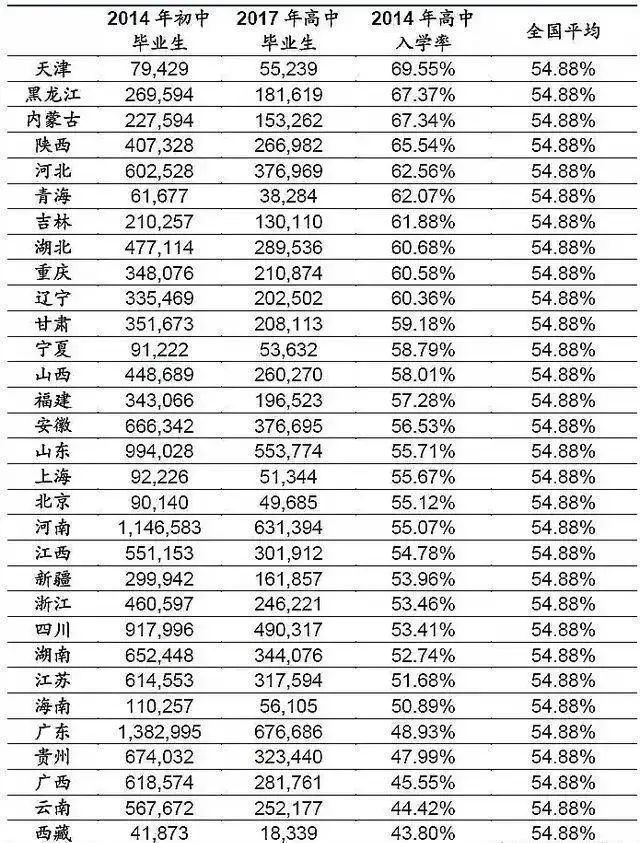 二、中考分流,让湖南省近47%的初中毕业生无缘普通高中。我们知道,初中毕业生在考高中时进行分流,全国普高入学率在55%左右,而湖南省的普高入学率更低,有47%的同学无缘普通高中。