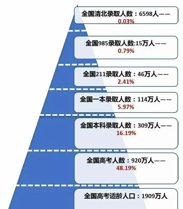 虽然说现在考大学跟二三十年前相比容易多了,感觉考一个本科大学比较容易,但真实情况却比较残酷,让很多学子无法进入本科大学学习。我们经常看到报道某高中一本率90%以上,本科率99%,但事实上还有很多高中,每年能考上本科的没有几个。实际上现在考本科大学也是不容易的,至少你能排在全国同龄人前20%才行。