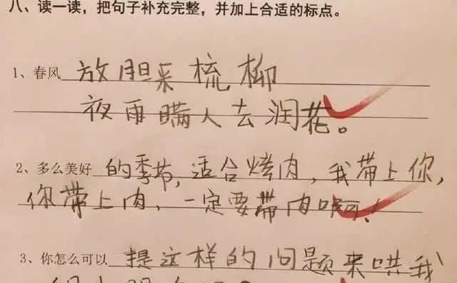 4、在小学生的试卷中,经常都有需要把句子补充完整的题目。而这位小学生真是脑洞大开,居然能把句子补充的栩栩如生,写出了雷人和奇葩的答案,就连老师都赞同这位小学生的答案,直接打了3个大大√。但接下来的这句就让大家笑出腹肌来了,“多么美好的季节,适合烤肉,我带上你,你带上肉,一定要带肉啊”!一再三强调要带上肉,可见这位小学生平时一定是个吃货,难道在家里你爸妈没有给肉你吃吗?如果被你爸妈看到后也会被你气晕,真的太搞笑了。