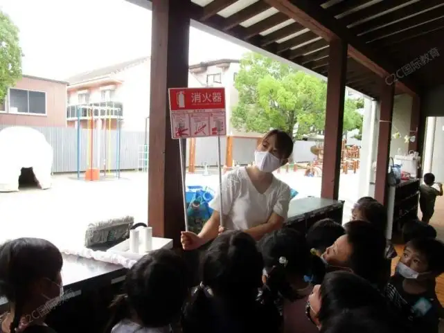 除了多发的地震,火灾演习也是幼儿园安全教育非常重要的部分,平时老师会带领小朋友学习消防相关的标志,学习使用灭火器