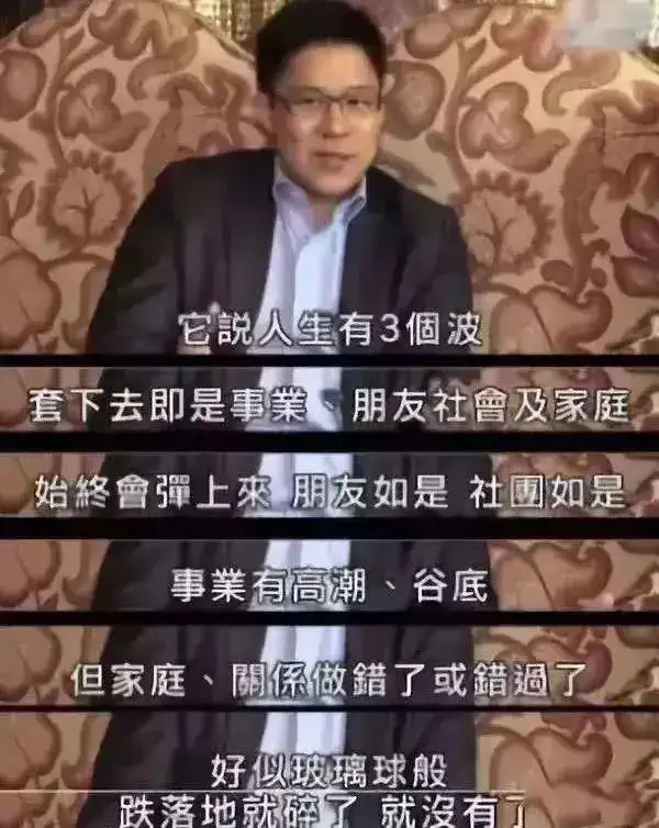 “人生有3个波,即事业、朋友及家庭。前两个始终会弹上来,但家庭关系做错了或错过了,好似玻璃球般,跌落就碎了,没有了。”