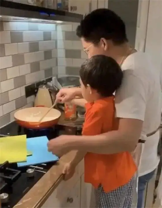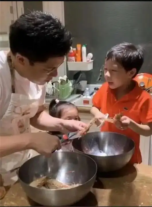 疫情期间,霍启刚在微博晒了一组带着两个孩子一起做饭的视频。