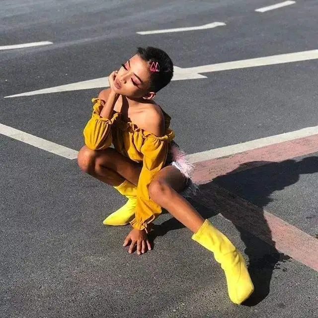 她的打扮非常有成年女性风韵,是及地长裙、高开叉,脚上踩着好几公分高防水台的高跟鞋,不论是走路姿态还是面上的浓妆,都给人一种和她实际年龄完全不配的成熟感,而这位13岁的少年则更加过火,他整个已经做女性打扮很久了。