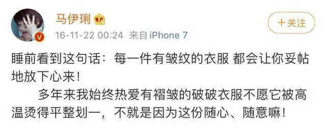她发过一条微博,似乎委婉地回应了这件事:「每一件有皱纹的衣服,都会让你妥帖地放下心来!」