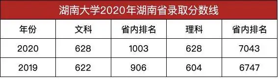 全国一卷,湖南大学2020年在河北录取分数线最高,文科录取最低分为627分,省内排名第975名,理科录取最低分为650分,与河南理科分数线并列第一,省内排名第7007名。
