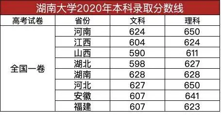 目前,湖南2020年各省份本科录取分数线已公布,全国卷,湖南大学2020年辽宁文科录取分数线最高,录取最低分为633分,理科录取分数线河南、河北并列第一,录取最低分为650分。