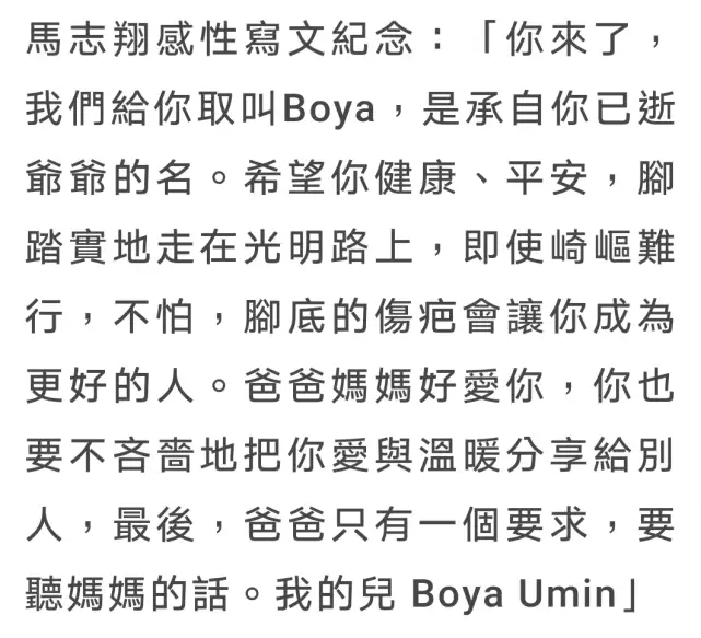 据台湾媒体报道,现年42岁的台湾男星马志翔于昨日(9月9日)正式升级当爸,他的妻子剖腹产平安生下一个大胖小子,夫妻俩为这一个可爱的小孩取名为Boya,并透露这个名字是为了纪念马志翔去世的父亲,因此儿子的小名也叫小波鸭。