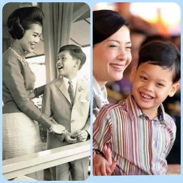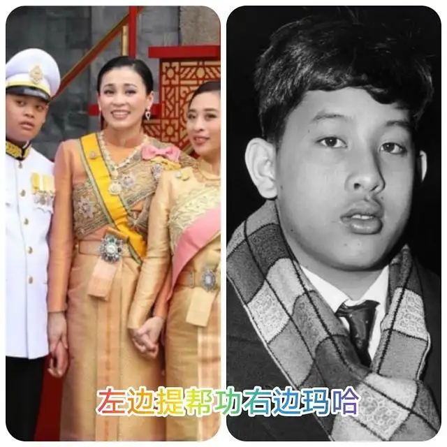 这是诗丽吉老王后年轻时一家人的合影,爸爸普密蓬老国王挺帅气,但只可惜孩子们都没遗传到爸爸的优良基因。而玛哈国王的基因,他的孩子们都遗传到了,尤其提帮功王子,他和爸爸玛哈小时候长得很像。尤其这个嘴简直就是一个模子刻出来的,还有这身材也太像了。