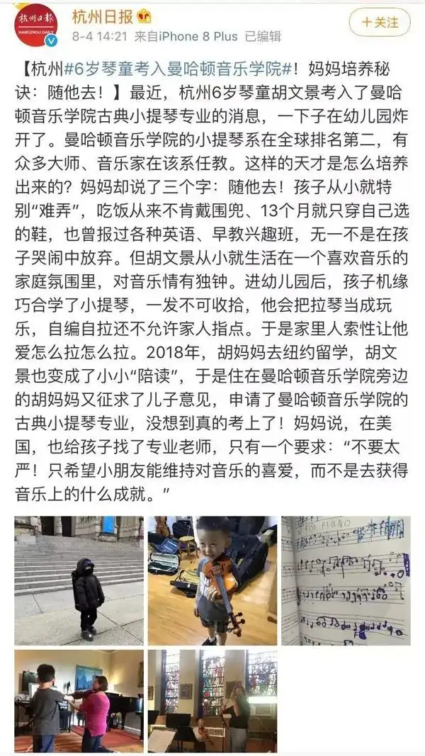 最近杭州6岁琴童考入美国纽约的曼哈顿音乐学院的消息在网上炸开了锅。